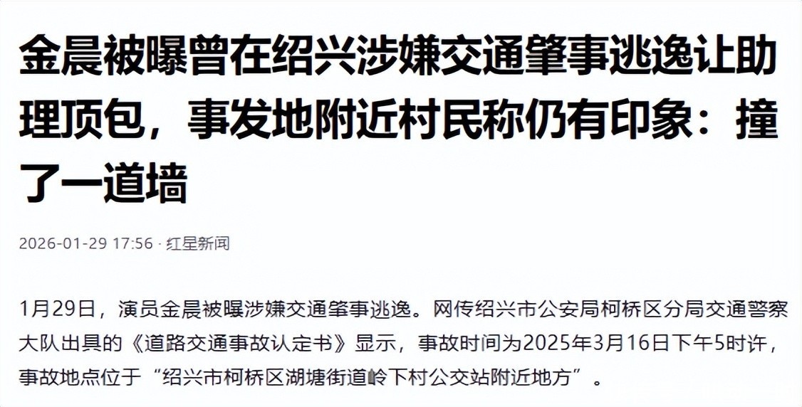 信息来源:原文登载于红星新日关于“金晨被曝曾在绍兴涉嫌交通肇事逃逸让助理顶包,事发地附近村民称仍有印象:撞了一道墙”的报道